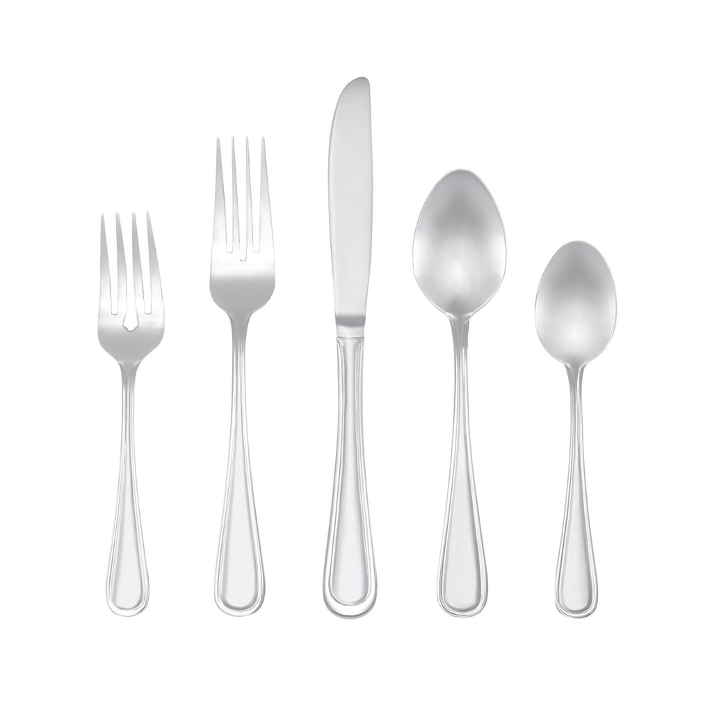 8 EACH DINNER FORK (2.5MM), DINNER SPOON (2.5MM), SALAD FORK (2.2MM), TEASPOON (2.2MM), DINNER KNIFE (80-85 GRAM); 1 EACH SERVING SPOON (2.5MM), SLOTTED SERVING SPOON (2.5MM), GRAVY LADLE (2.5MM), SERVING FORK (2.5MM), BUTTER KNIFE (2.2MM), SUGAR SPOON (2.2MM)