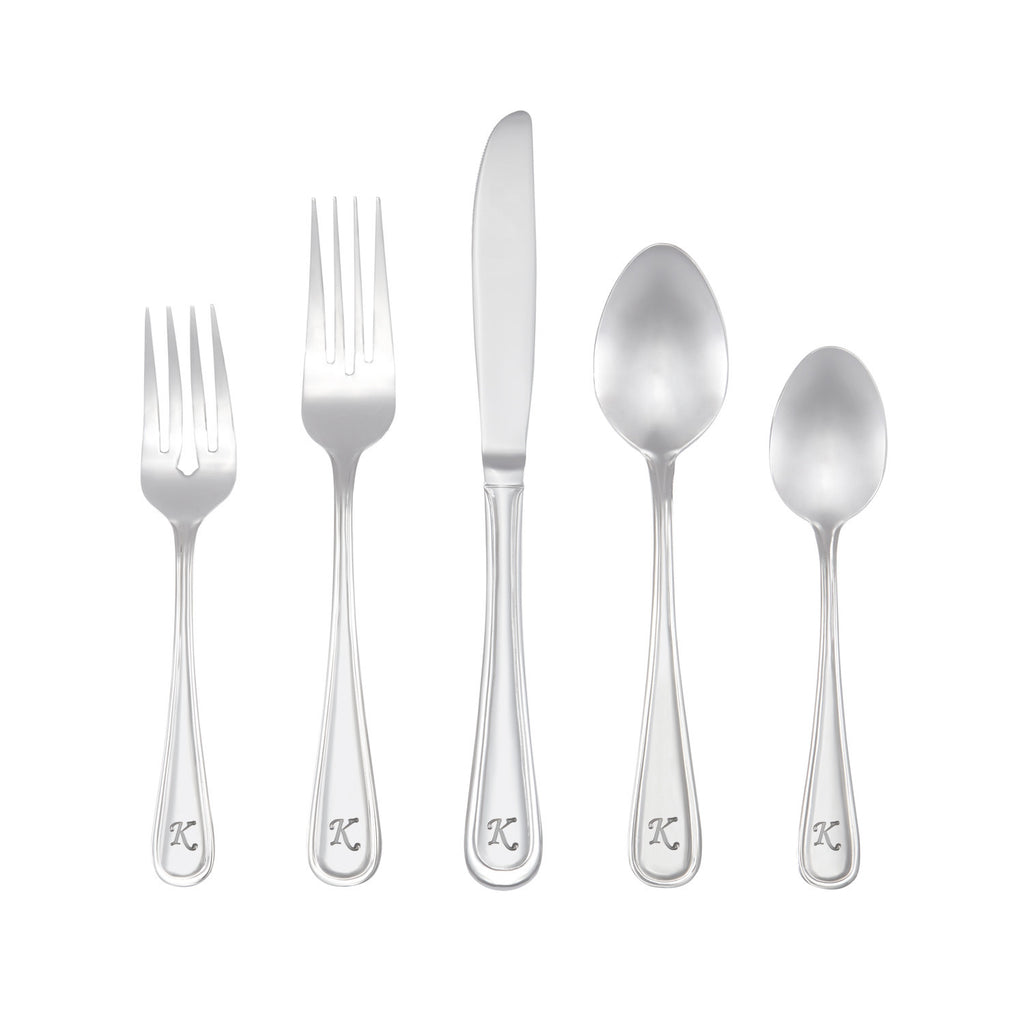 IMPRESS FAMILY AND DINNER GUESTS WITH A PERSONALIZED FLATWARE SET. EACH PIECE IS PERMANENTLY STAMPED WITH THE LETTER OF YOUR CHOICE. ALL 26 LETTERS AVAILABLE. ALSO AVAILABLE WITHOUT MONOGRAM LETTER.PERFECT BOTH FOR DAILY USE AND SPECIAL OCCASIONS. SOPHISTICATED AND VERSITILE MARINA DESIGN WILL COORDINATE WITH ANY TABLE SETTING. MAKES A GREAT GIFT—WEDDINGS OR HOLIDAYS. FEATURES HEAVIER GAUGE AND FULL-SIZE PIECES. 18/10 STAINLESS STEEL HAS POLISHED MIRROR FINISH AND IS HIGHLY RESISTANT TO RUST AND STAINING. DISHWASHER SAFE.