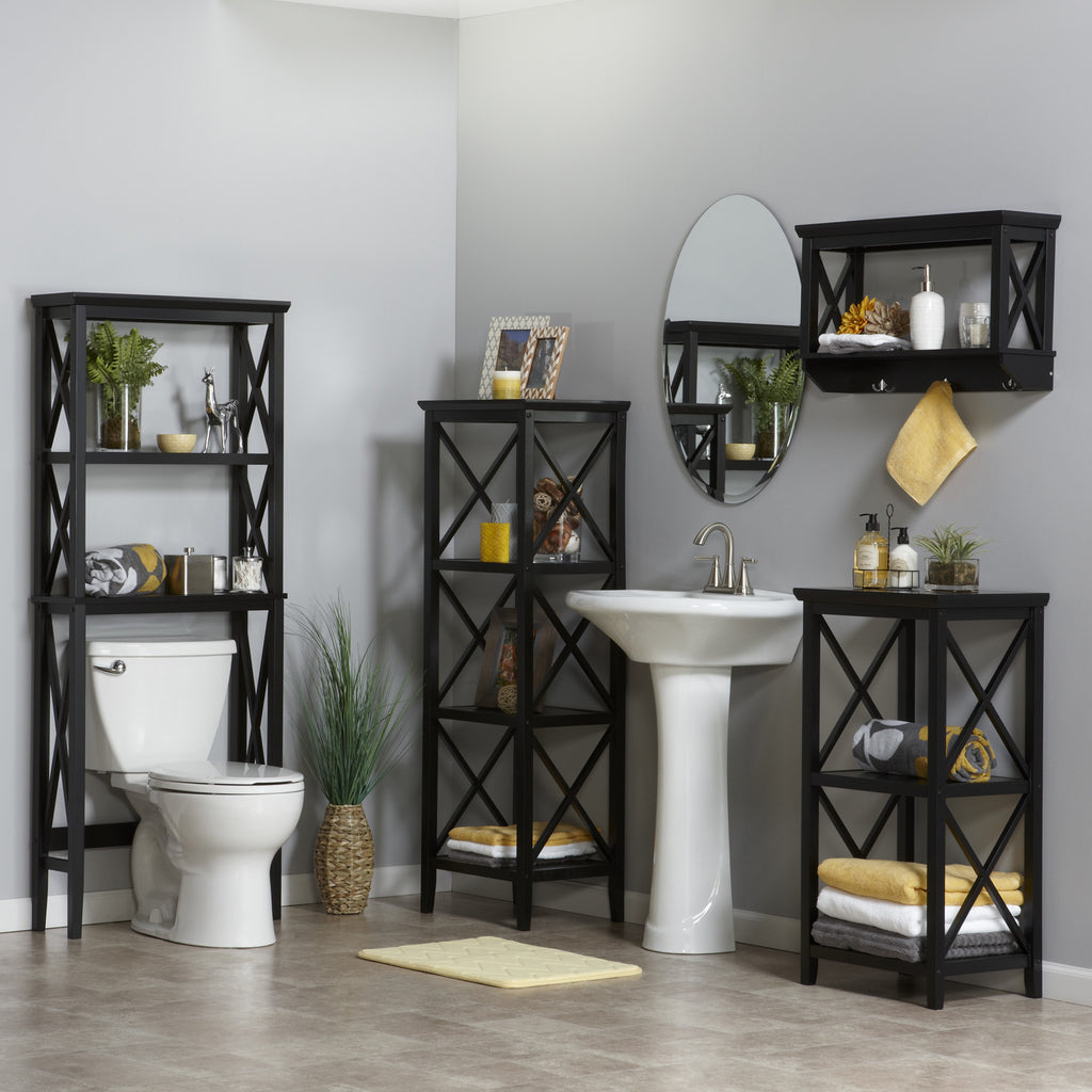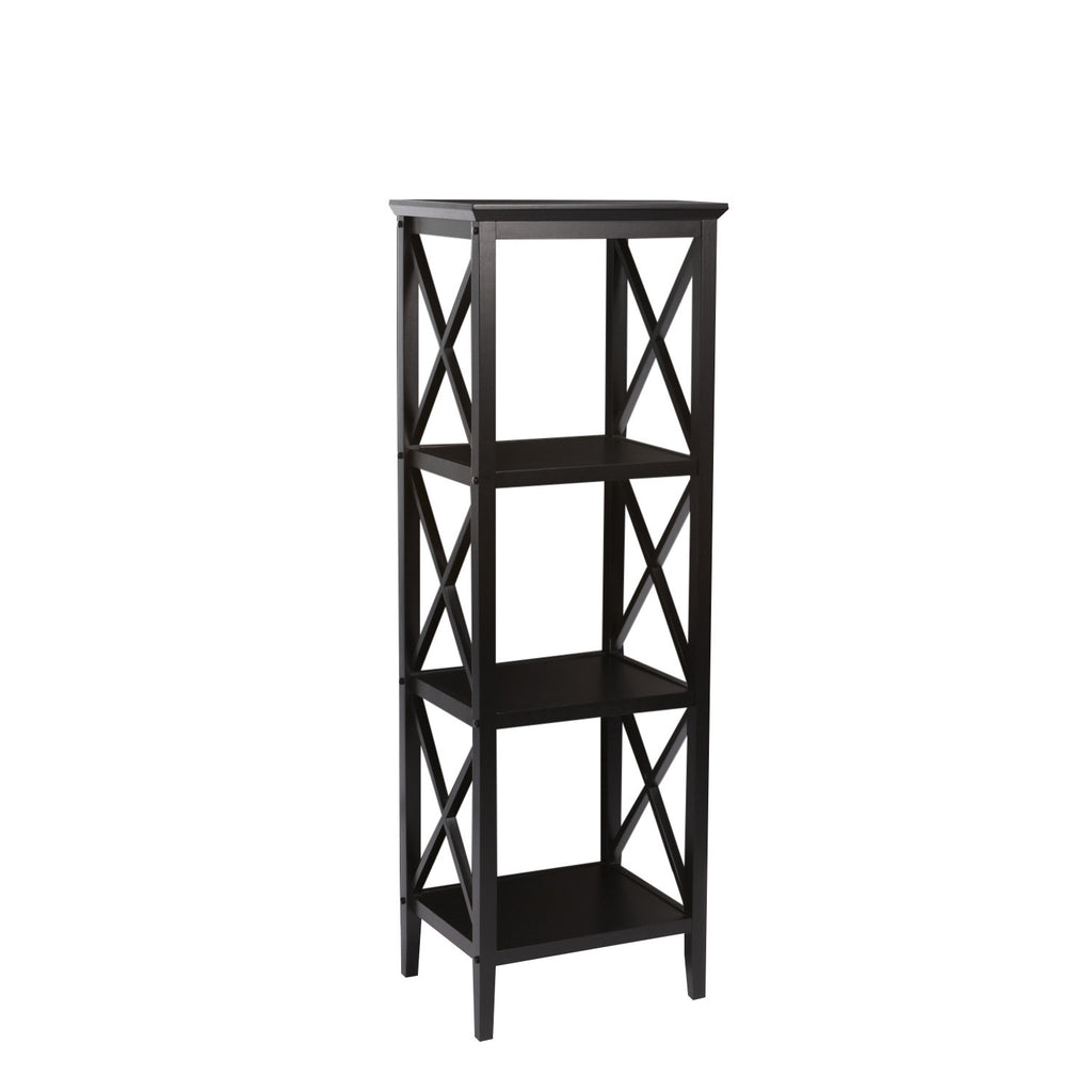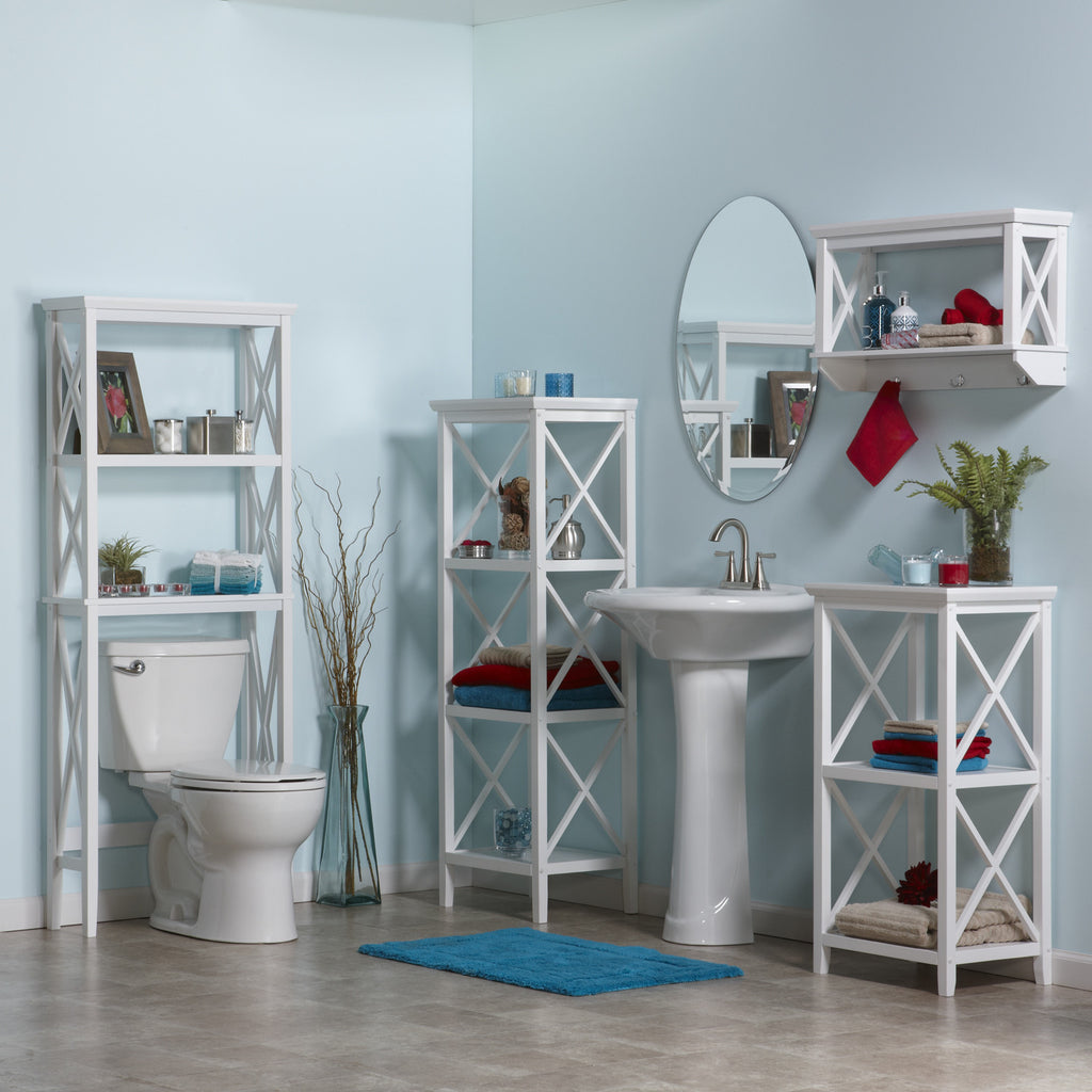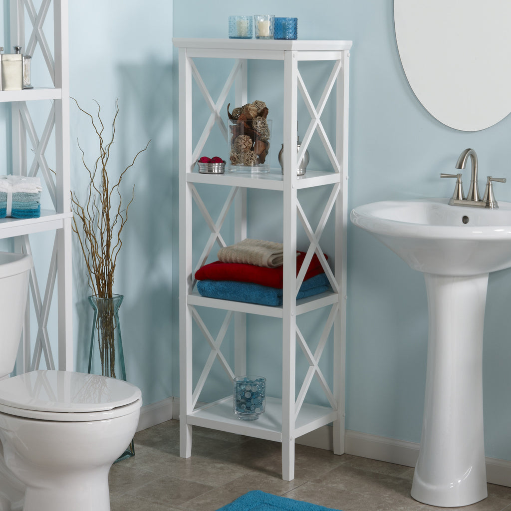 FUNCTIONALITY MEETS STYLE IN THIS SIMPLE, YET CONTEMPORARY SHELVING UNIT PERFECT FOR STORING TOILETRIES AND TOWELS AND DISPLAYING DECORATIVE ACCENTS. THREE FIXED, OPEN SHELVES, PLUS A TOP SHELF FOR MAXIMIZING STORAGE SPACE. FIT FOR USE IN THE BATHROOM OR OTHER ROOMS IN THE HOUSE. ABILITY TO ANCHOR TO WALL FOR ADDED STABILITY. REDECORATE THE ENTIRE BATHROOM WITH THREE ADDITIONAL RiverRidge® X-FRAME COLLECTION ITEMS.